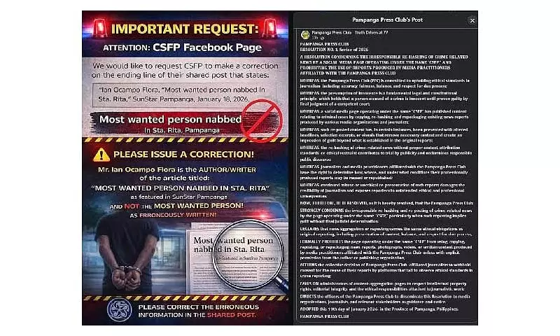 The Pampanga Press Club (PPC) has issued a strong condemnation against a Facebook page for what it calls the irresponsible rehashing of crime news, an act it says severely undermines journalistic ethics and the legal principle of presumption of innocence.